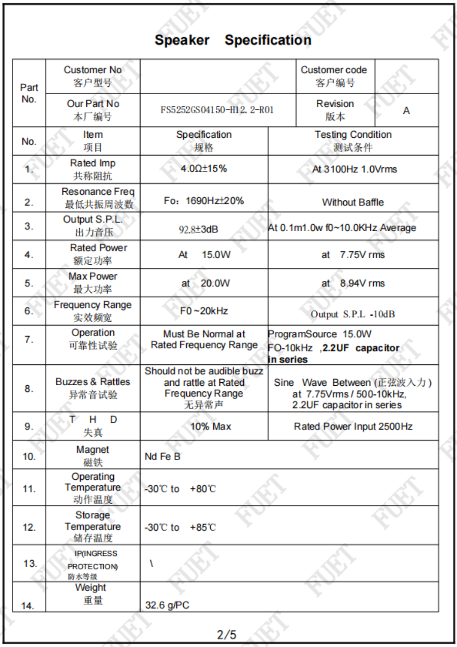 最低共振周波數(shù) 1690Hz±20% Without Baffle